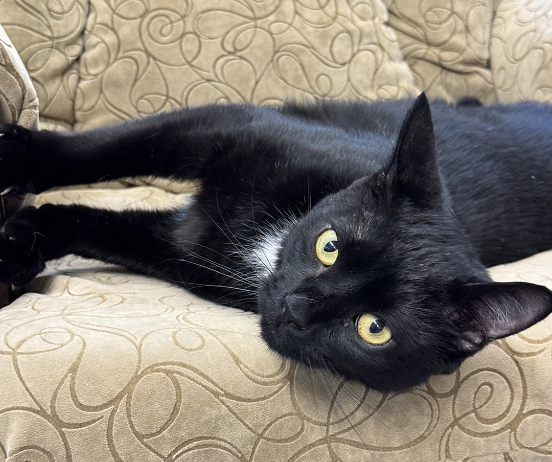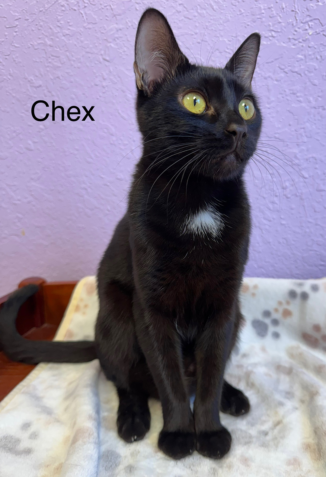 Chex is one of our sweetest cats. He is a super friendly, playful and affectionate young boy. He loves to crawl in your lap for some head scratches and cuddle time. Chex also loves to play with his spring toys, wand toys and hang out in his cat tree. He would be a great addition for a family that is looking for a friendly and easy going cat. Chex is good with other cats.